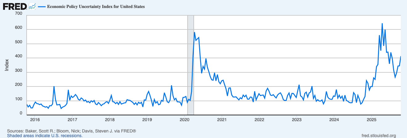 Economic uncertainty, as measured by the aptly named Economic Policy Uncertainty Index, is climbing again. It’s no wonder, with Trump announcing new tariffs willy-nilly, threatening to further gut the nation’s largest employer while it remains shuttered over his efforts to deprive Americans of health coverage, and sending federal troops from Texas to Illinois invade Chicago.